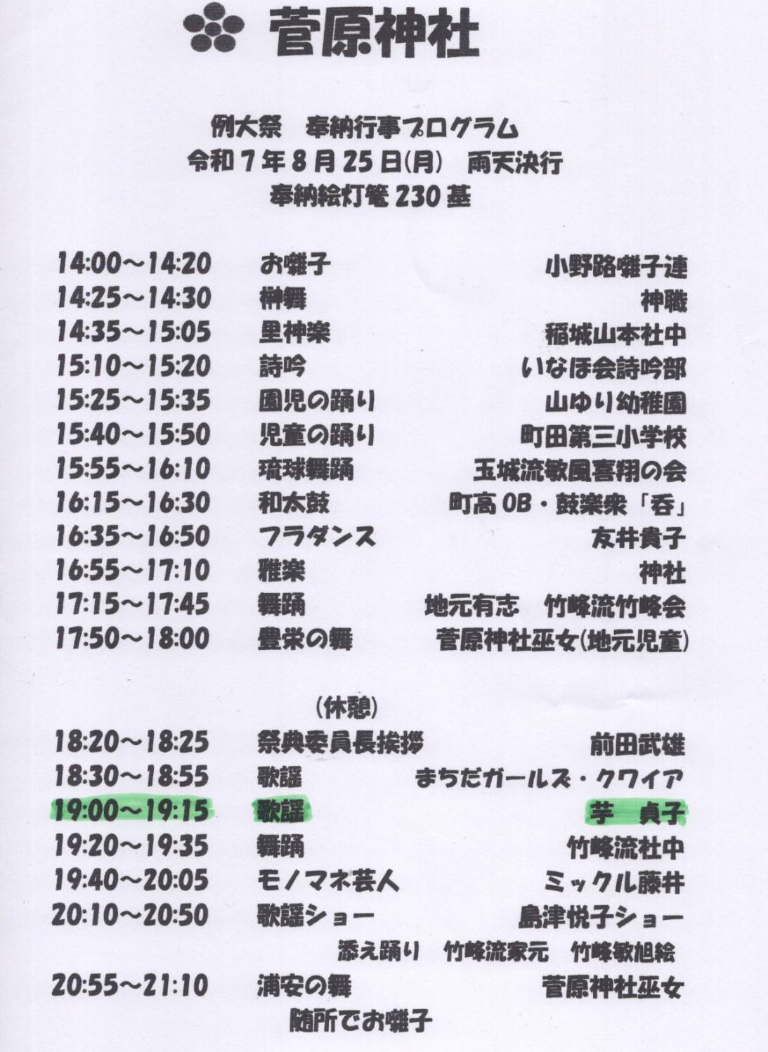 • 8月25日(月) 東京都町田市の「菅原神社」の夏祭りで、19時~歌唱